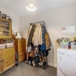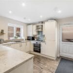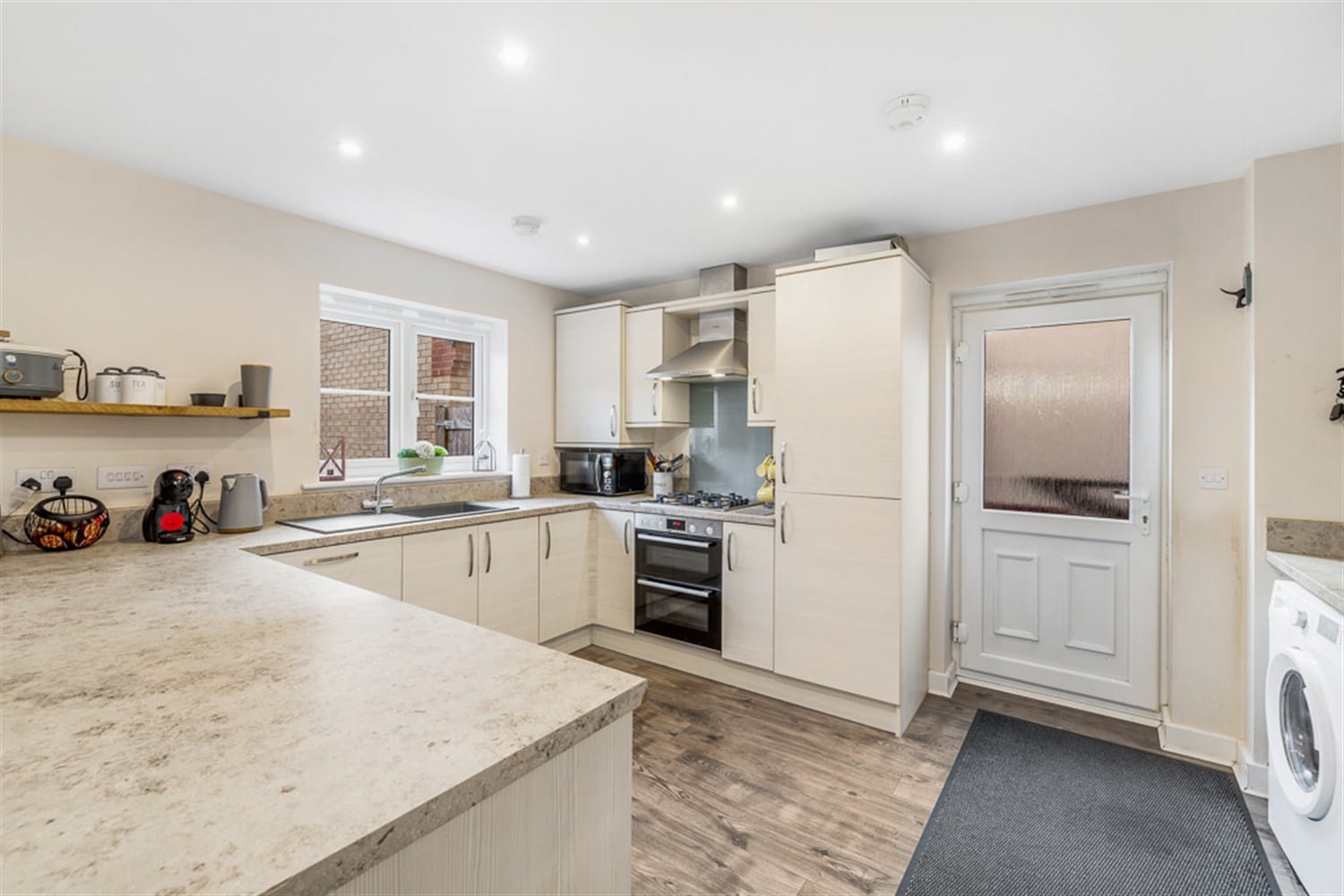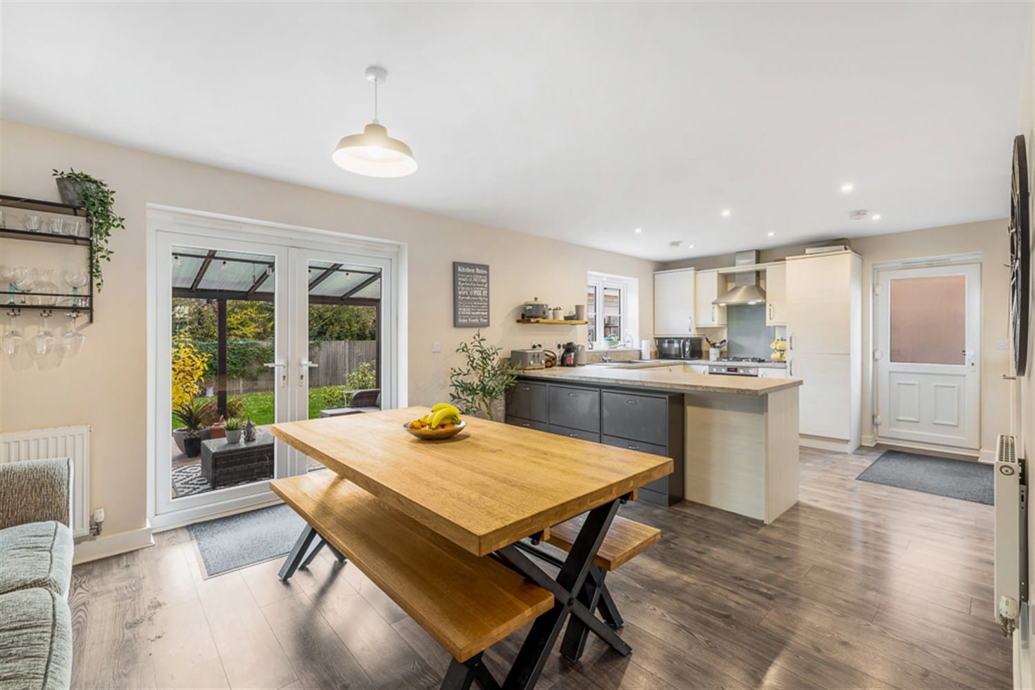 This lovely kitchen diner presents a variety of modern style storage cupboards and units with work tops over. Featuring a built-in electric oven and grill with gas hob and extractor fan over, an inset sink and drainer with mixer tap over, two double panelled radiators and a breakfast bar area with seating. The dishwasher and fridge freezer are both built in, there is space for a washing machine, a dining table and a sofa. Lots of light is reflected into this kitchen diner through the window to the rear aspect and the French doors out into the garden.