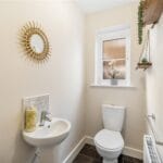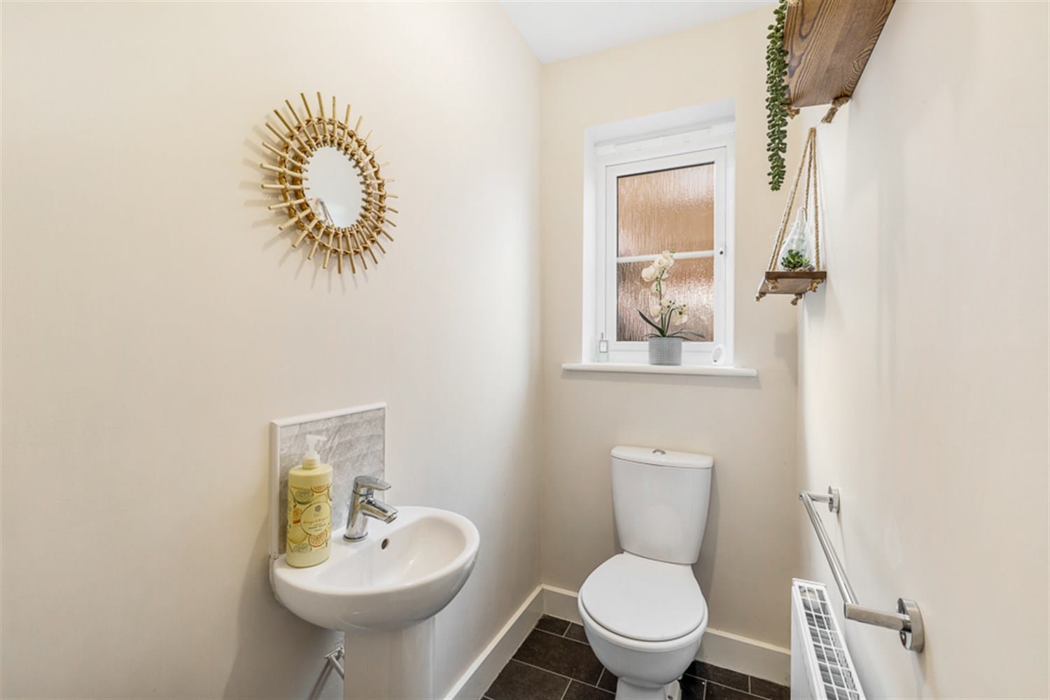 Double glazed frosted window to the side aspect, WC, double panelled radiator and a pedestal sink with mixer tap.