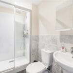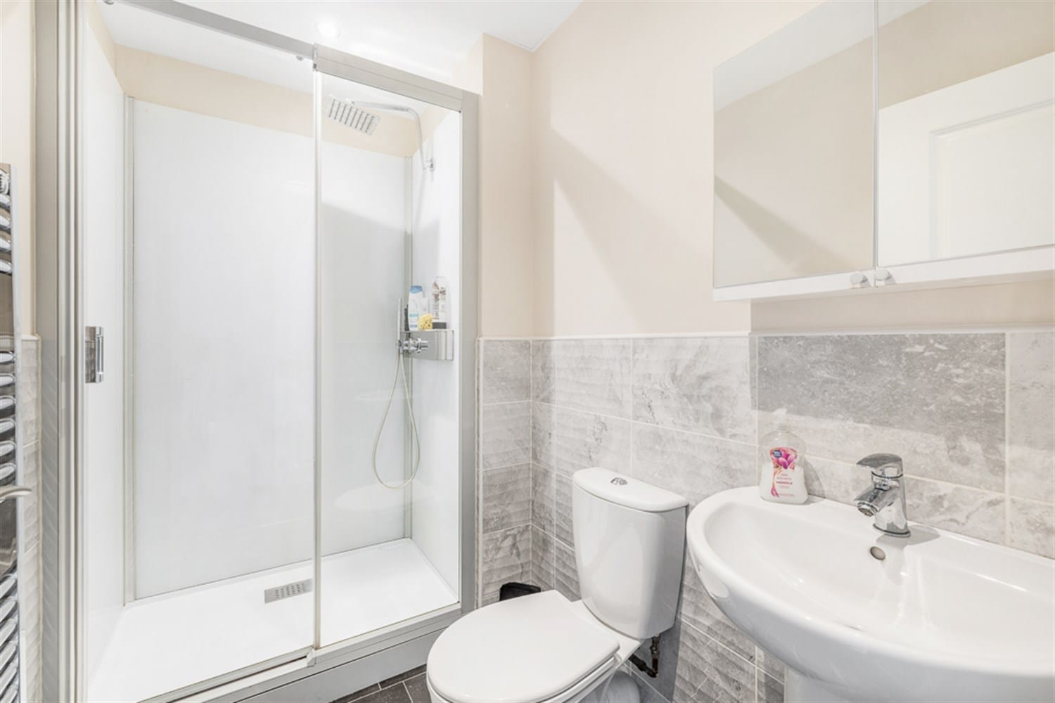 Brilliant ensuite featuring a double shower cubicle, double shower head, push button WC, pedestal sink, and a heated towel rail.