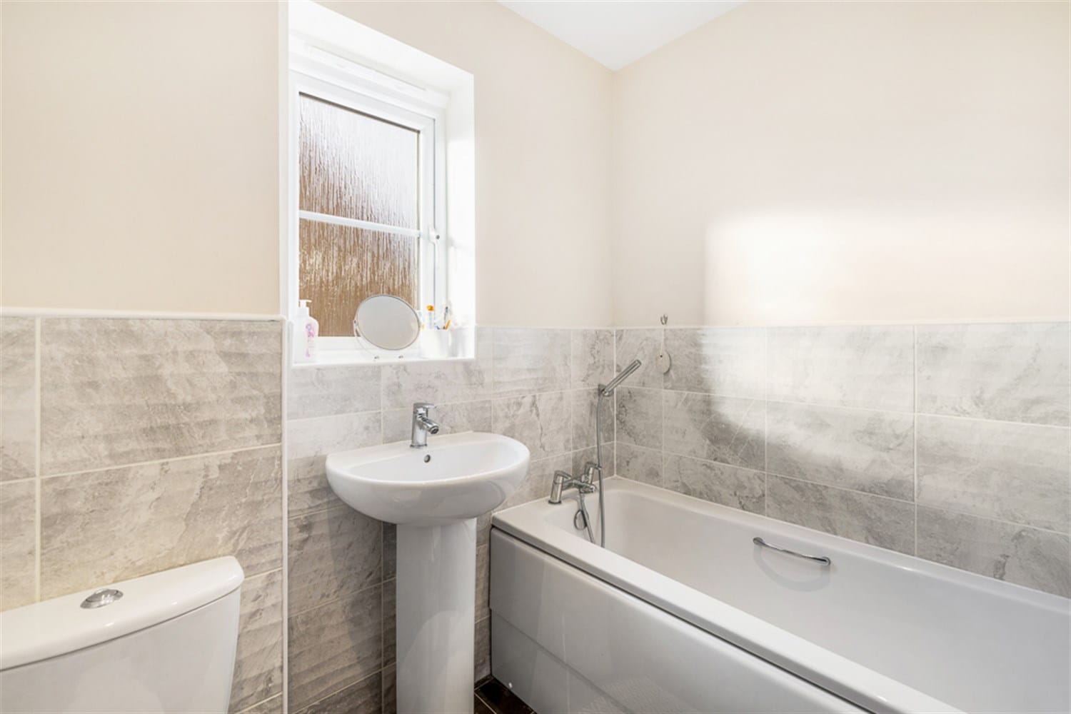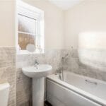 Modern family bathroom featuring a panelled bath with mixer taps and shower attachment, pedestal sink, push button WC, heated towel rail and a frosted window to the side aspect.