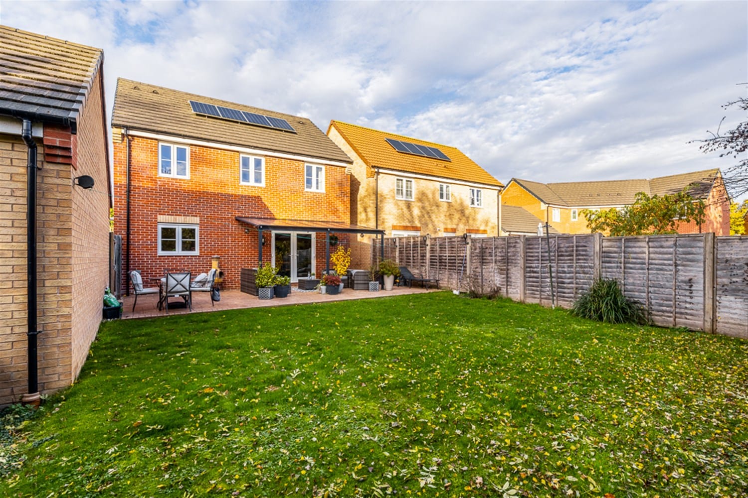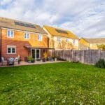 This rear garden features a modern patio area with a south facing lawn, fence to all three sides and a side gate. There are also trees beyond the fenced boundary creating a lovely private garden.