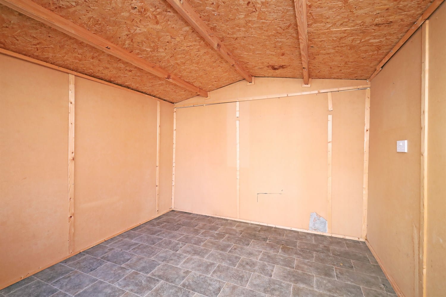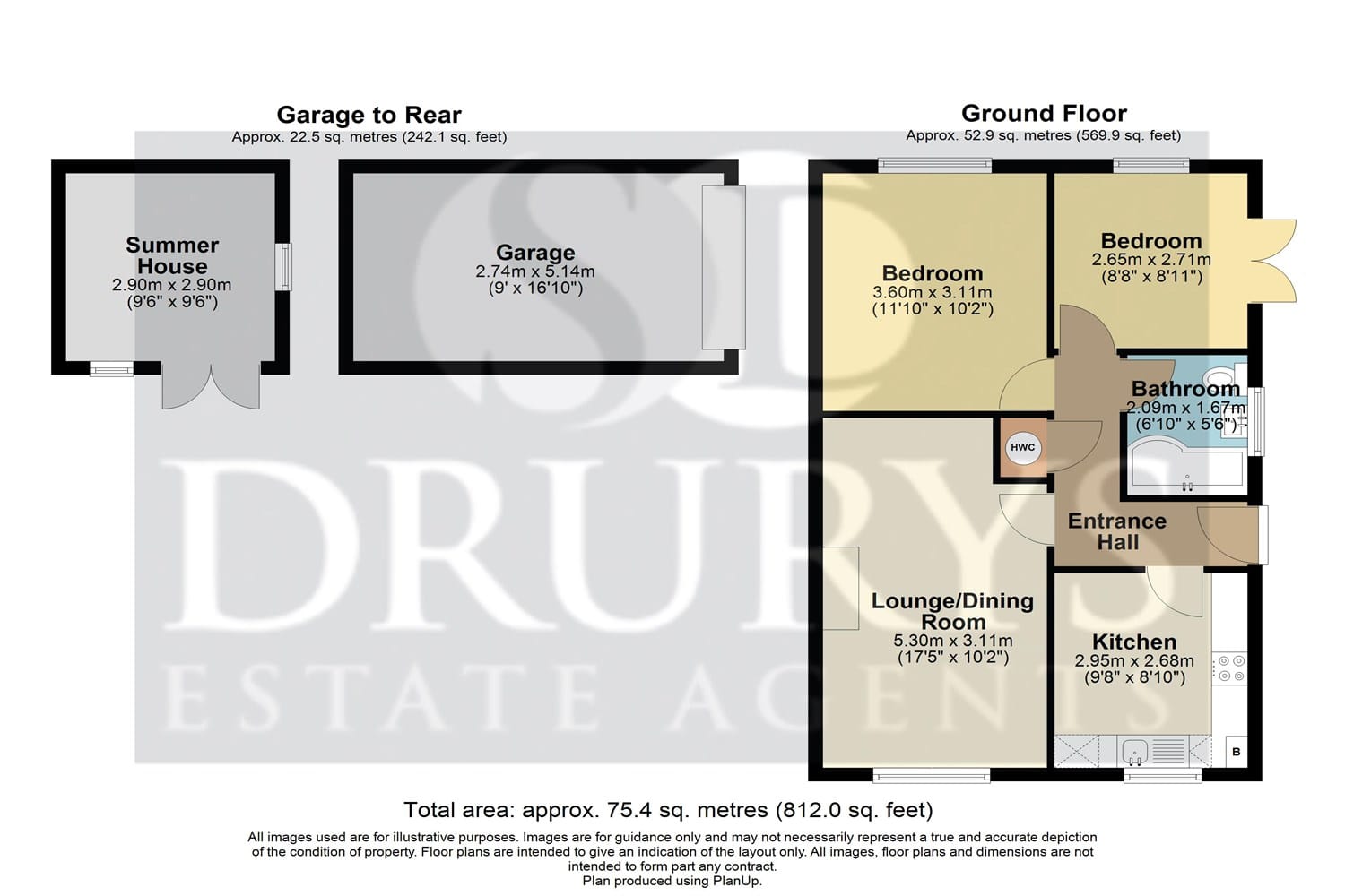 Medium sized garden with a lawn area and a patio area. Also featuring a summer house and a side gate.