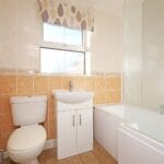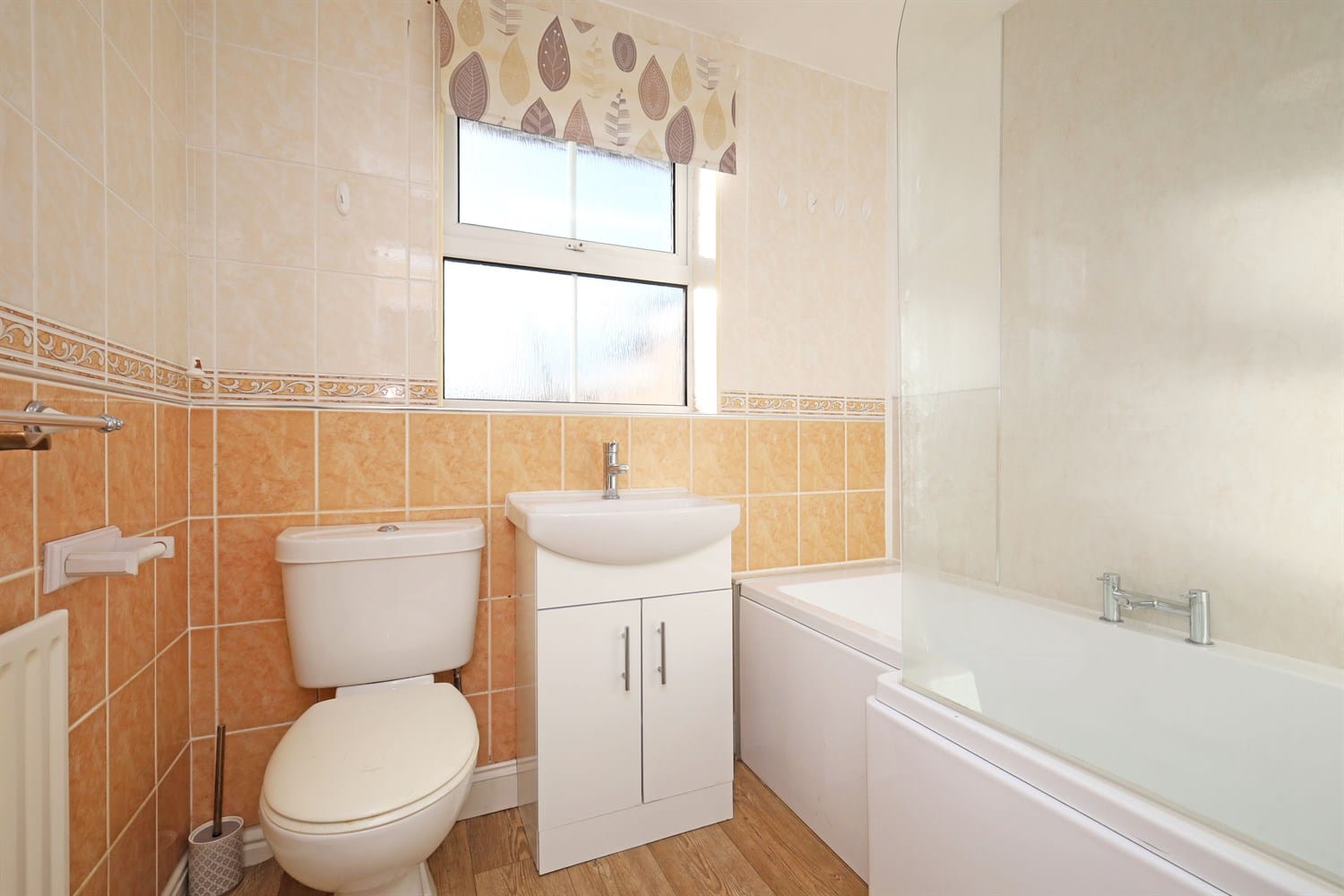Lovely bathroom featuring a bath, handwash basin with storage, WC, window to the side aspect and a single panelled radiator.