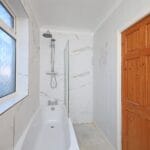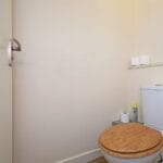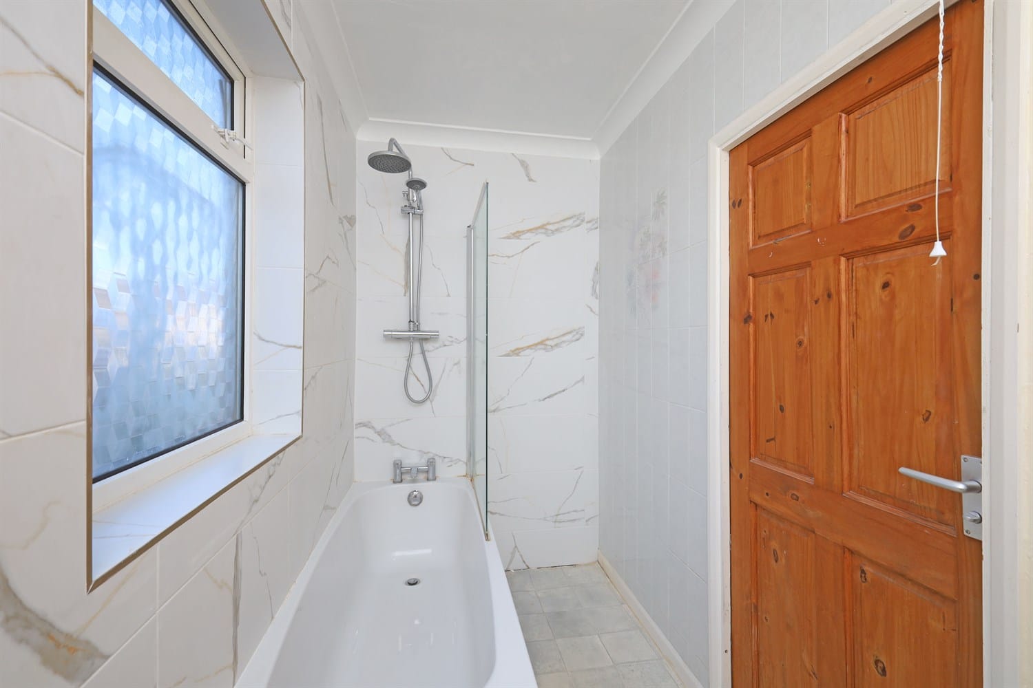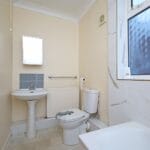 Having a three piece suite with WC, pedestal sink, bath with shower over and frosted window to the side aspect.