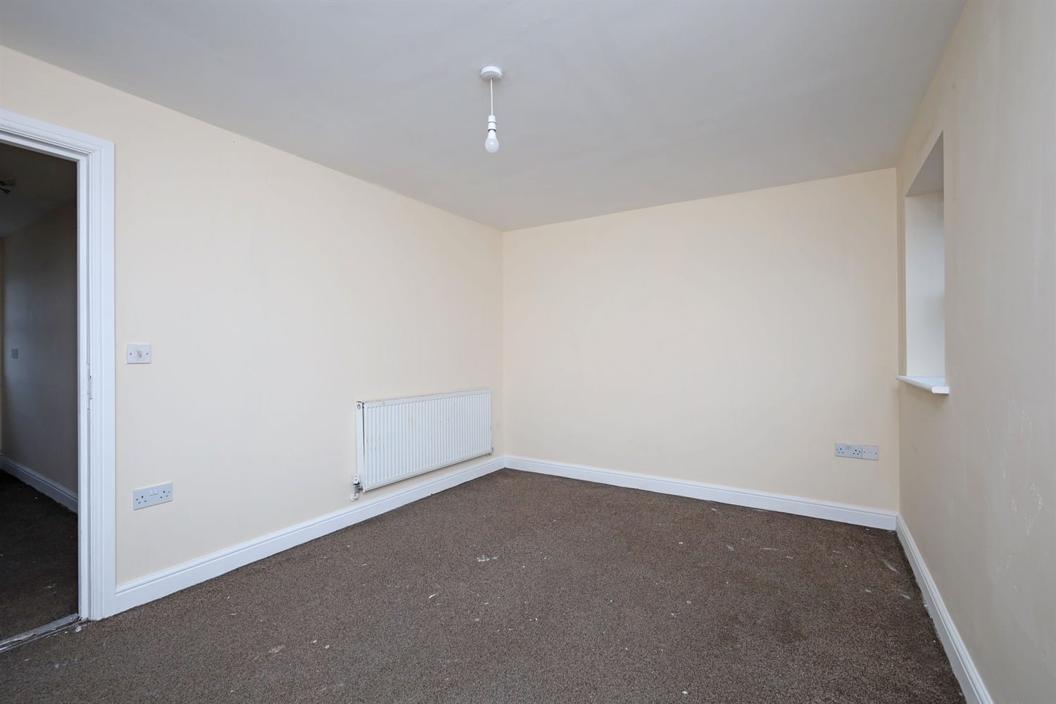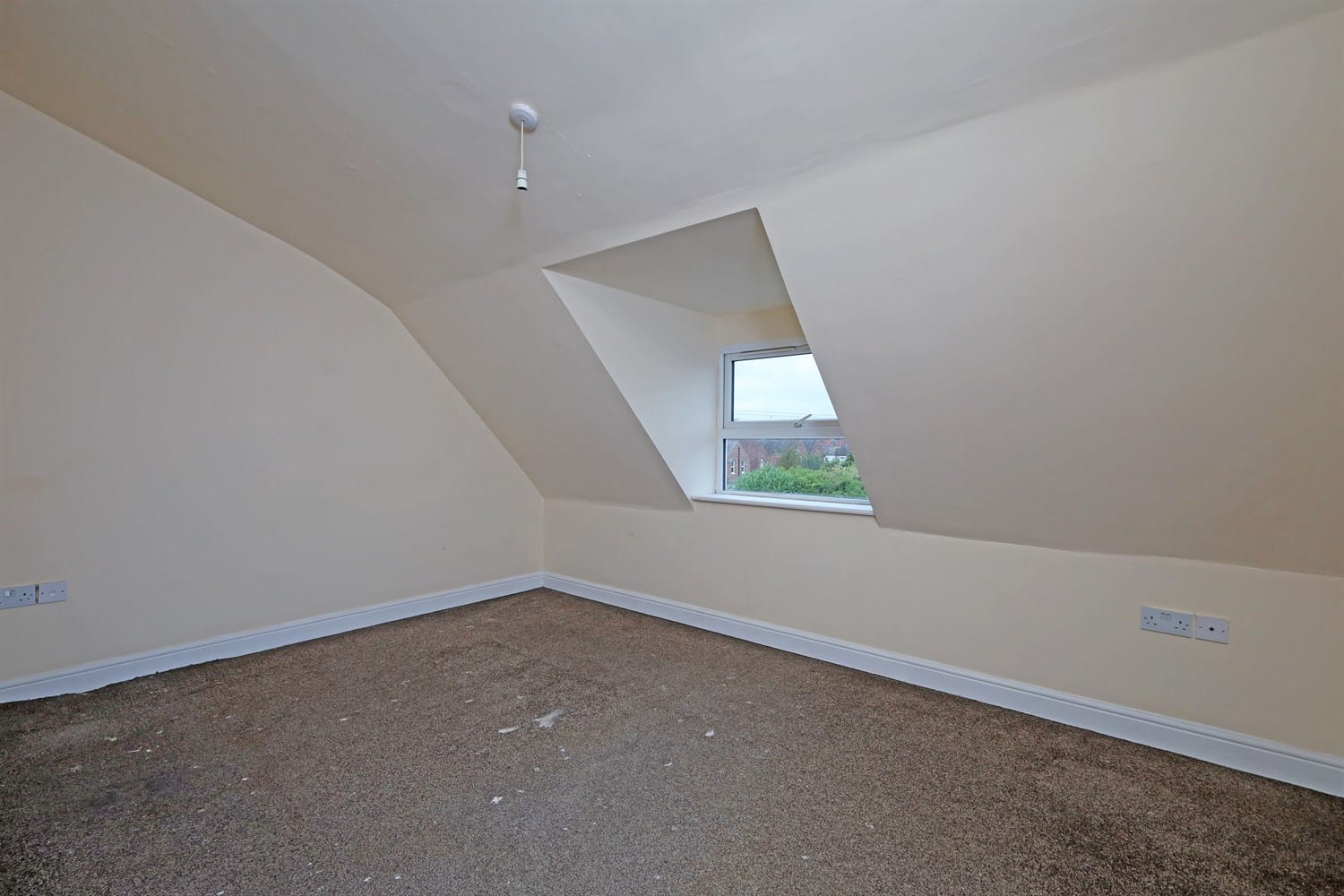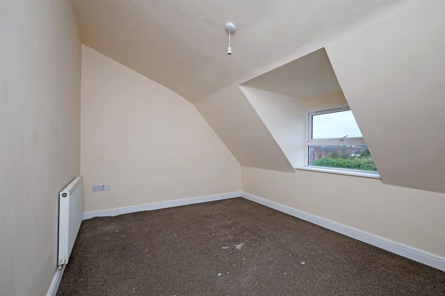 Double bedroom featuring a slanted ceiling, multiple electric sockets, double panelled radiator and a window to the front aspect bringing in lots of light.