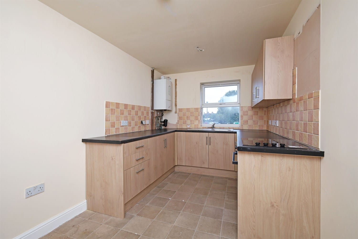 Bright and modern kitchen / diner area, having a window to rear elevation cupboards to both base and eye level, a new oven / hob and lino flooring.