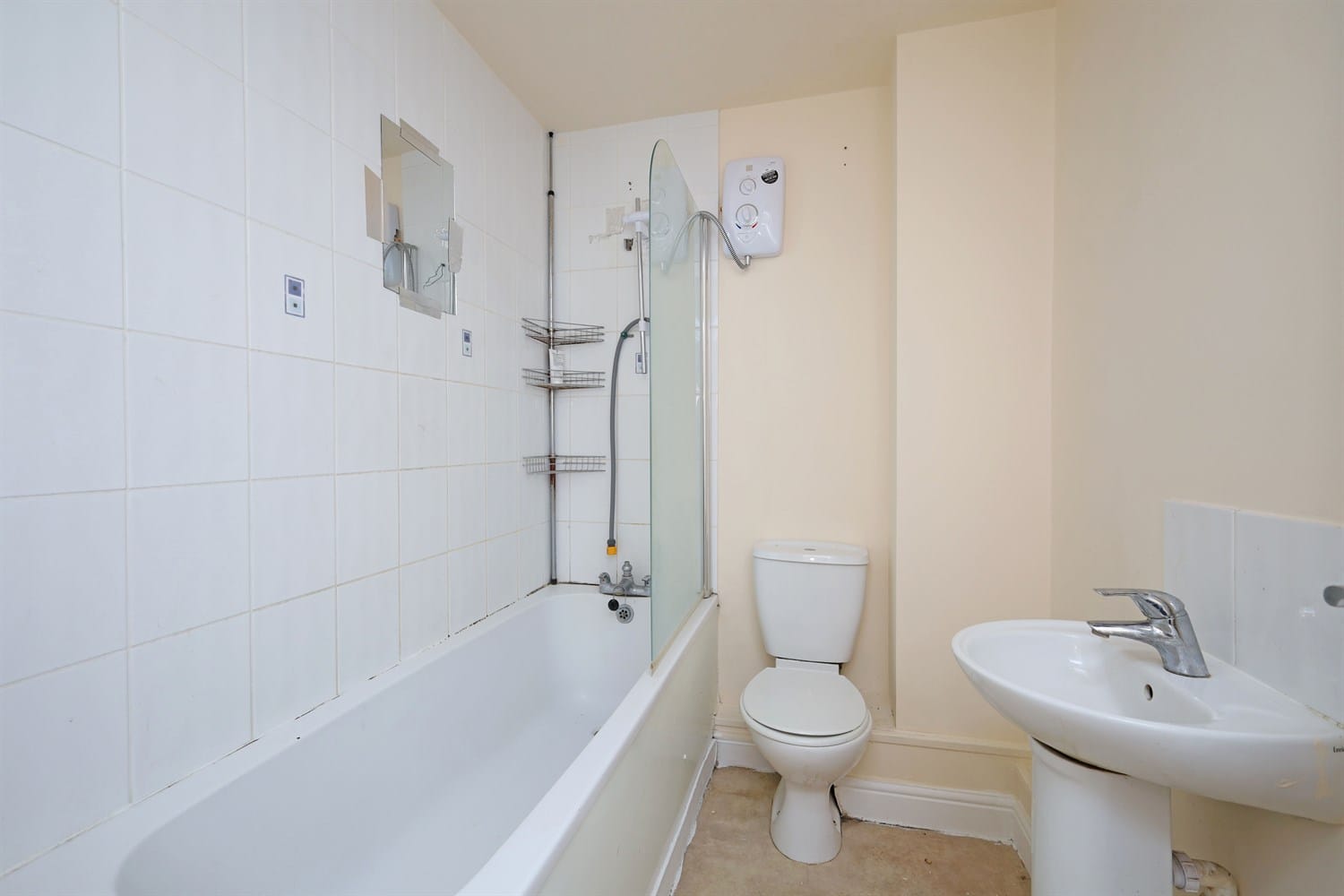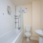 Family bathroom featuring a double panelled radiator, over bath shower (electric), toilet, hand wash basin and access to the attic.