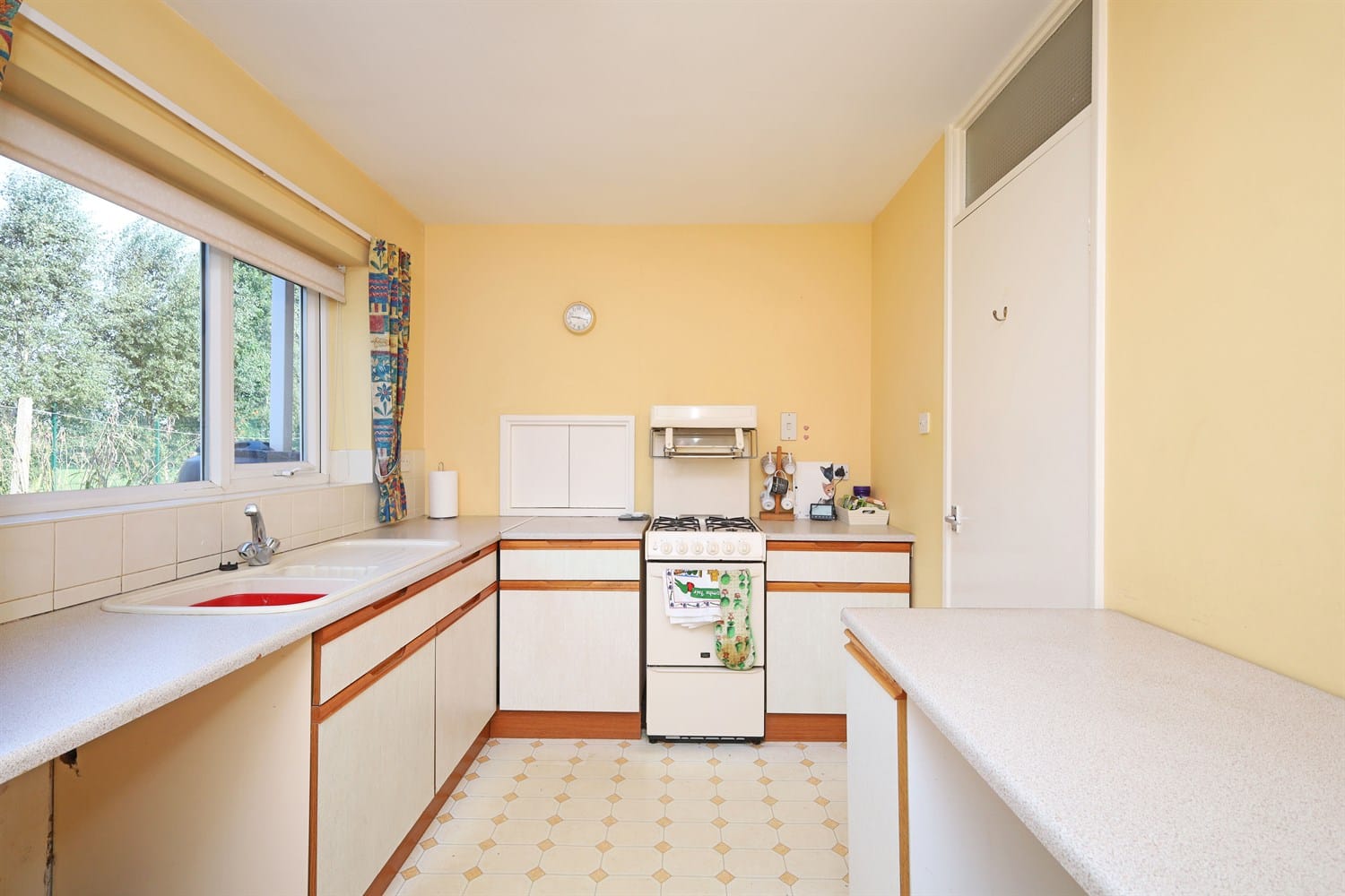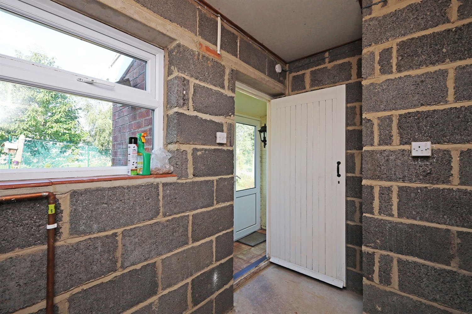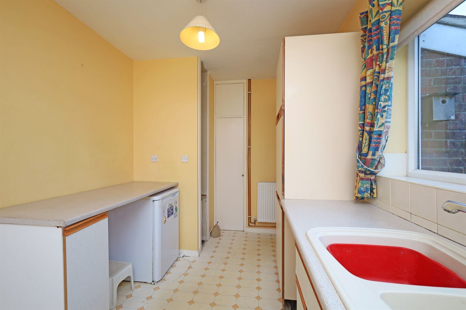With wooden units mainly to the base level with a worktop over and plumbing and space for a washing machine and fridge. A window to the rear aspect and access to the potential utility/workshop.