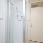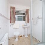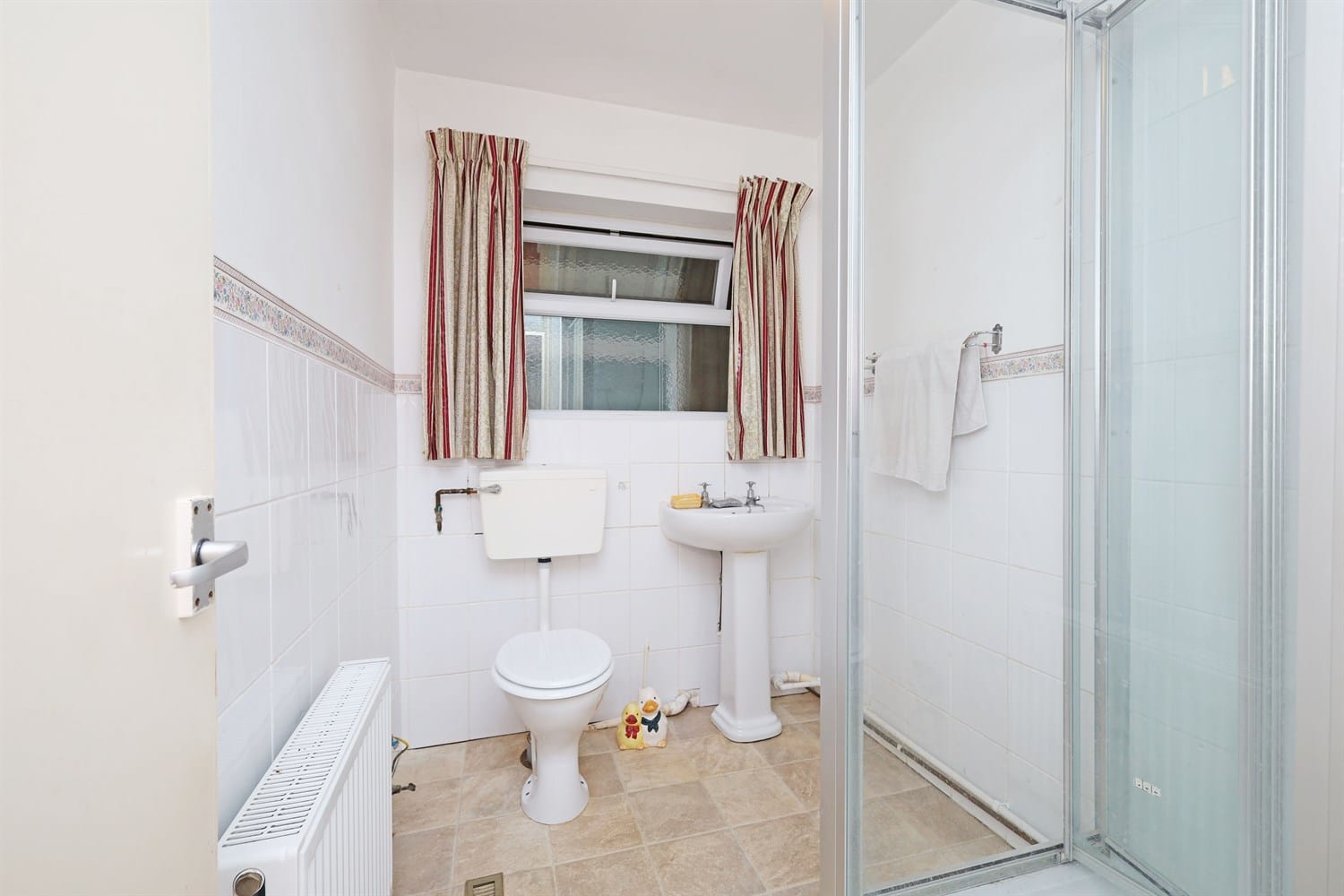 A three piece bathroom with a shower, WC and pedestal sink. Featuring a frosted window and radiator.