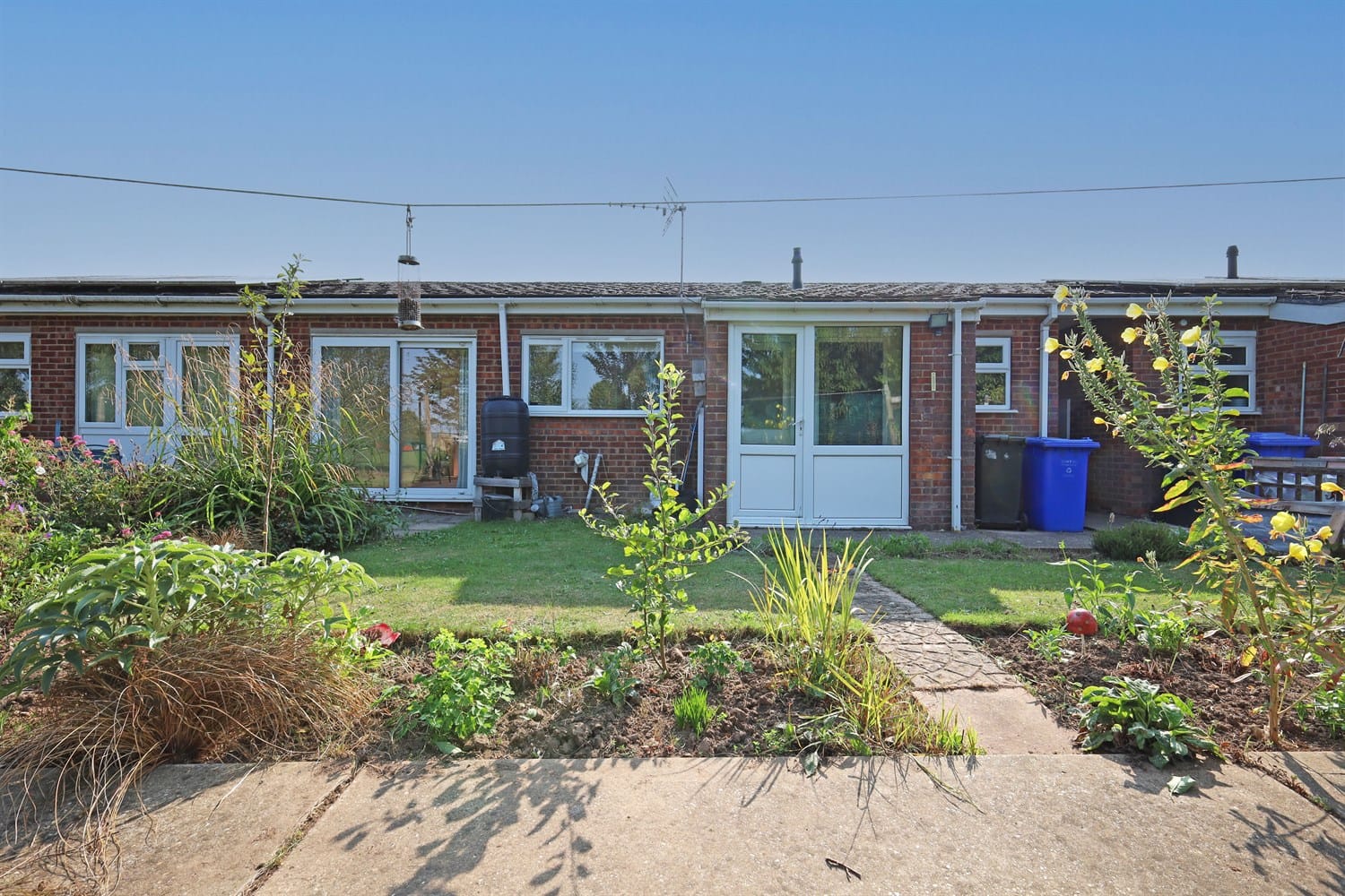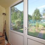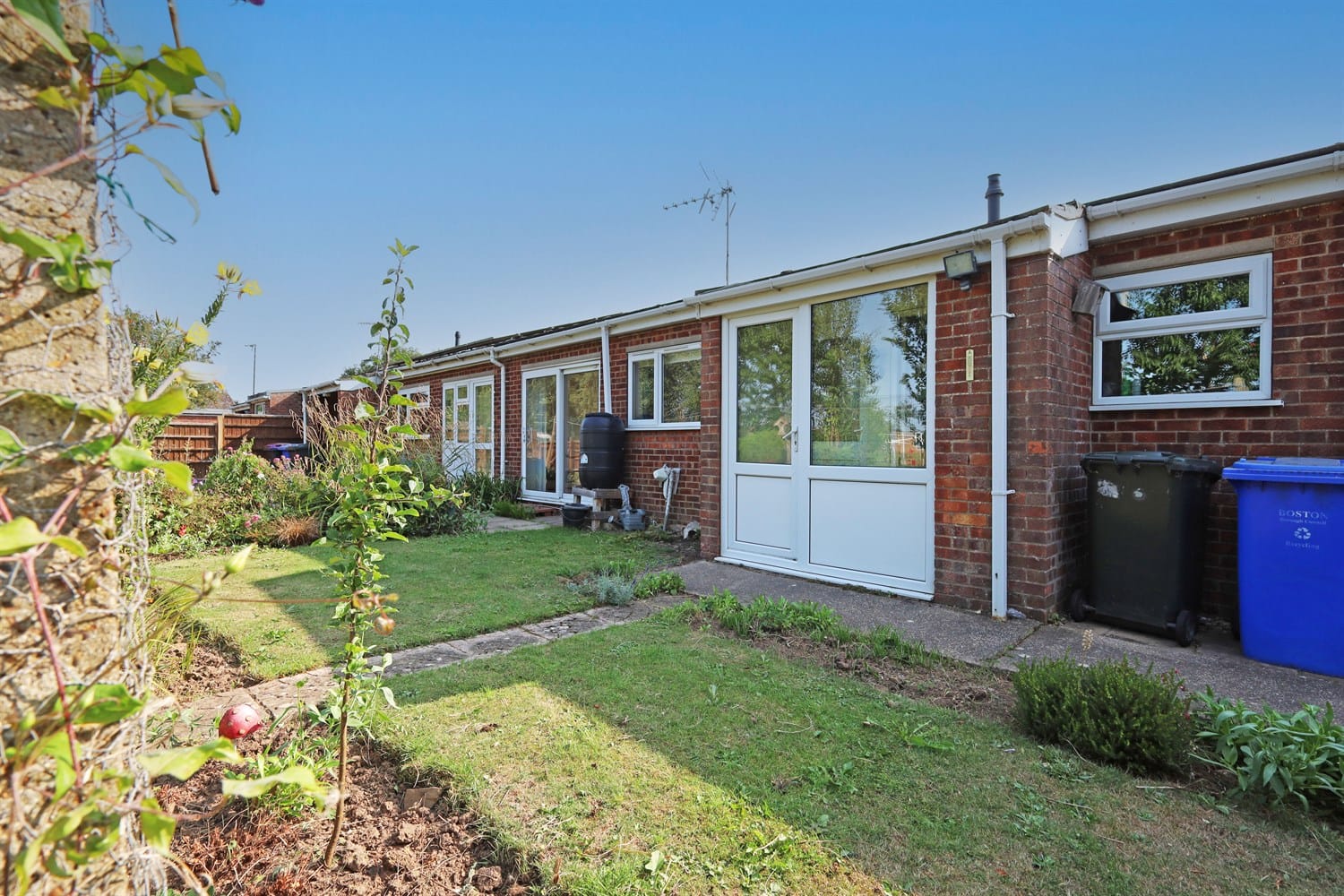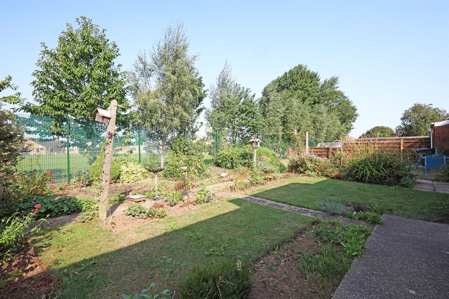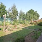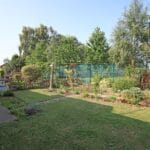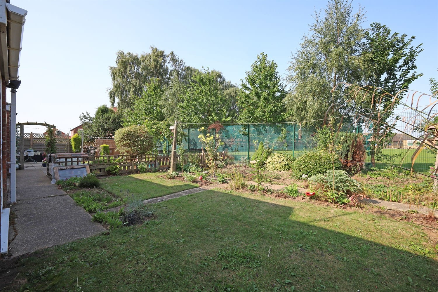 An enclosed rear garden with lawn and pathway.